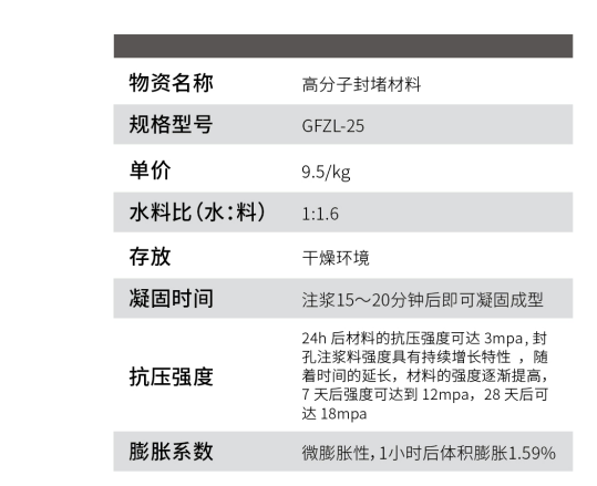 高分子封堵材料是劲合实业与中国矿业大学合作研发的专用材料,在复杂地质条件下能解决严密封堵问题。该封堵材料适用于0一90。不同角度、巾75一巾120mm不同孔径的探水钻孔和复杂地质条件下的钻孔封堵。